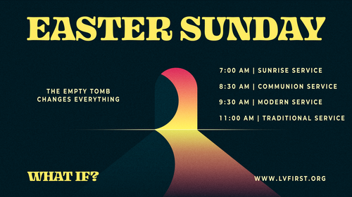 Join us at 9:30 AM for a Modern/Contemporary worship service led by our LVfirst worship band! If you like jamming out to Elevation Worship, Hillsong United, and others - this is the worship service for you. Our worship team has been preparing a special service of music to lead us through the Easter story and celebrate the resurrection!