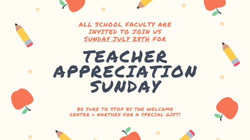 Join us this upcoming Sunday, July 28th for a special time of blessing and appreciation for all of our school faculty. Be sure to stop by the Welcome Center to pick up a special gift just for you!