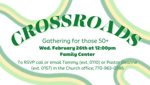 Crossroads (a ministry for adults 50+) will meet in the Family Center on February 26th at 12:00PM. Please contact Pastor Deanne (ext. 0157) or Tammy (ext. 0110) to RSVP.