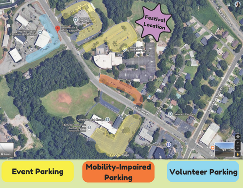 Above is a map that outlines the available parking for Easter Festival. We want to say a big thank you to the Lawrenceville Co-Op and Central Baptist Church for allowing us to use their parking lots for this event. Parking at Lawrenceville Elementary School is very limited and we are asking everyone to please reserve the upper parking lot for those who are mobility impaired and parents with strollers.