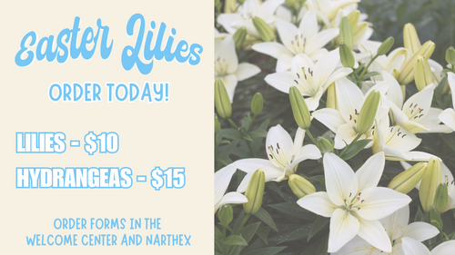 If you would like to place an order in memory or in honor of a loved one, please complete an order form and attach a check, made payable to FUMCLV, with Easter Flowers in the memo line. You may put your order in the offering plate or place it in the Music Minister mailbox.